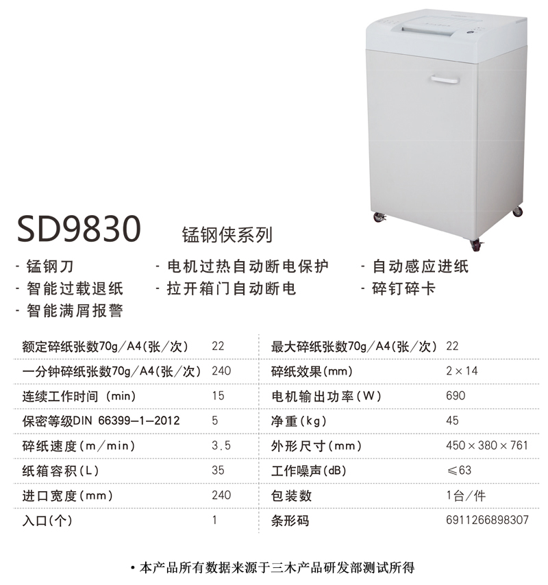 三木(SUNWOOD)SD9830 碎纸机 碎卡机 大型碎纸机 大功率高效率 电动办公可碎22张