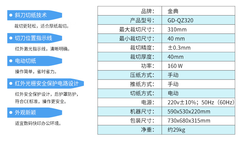 金典(GOLDEN)GD-QZ320电动切纸机A4台式桌面裁纸机厚层切纸机重型切纸刀裁刀 QZ320