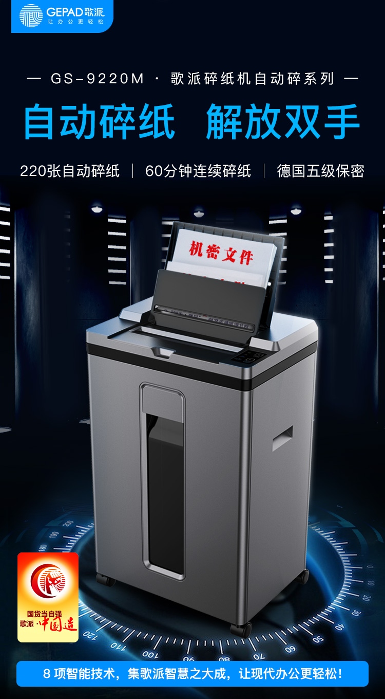 歌派(GEPAD)GS-9220M 5级保密办公商用全自动碎纸机